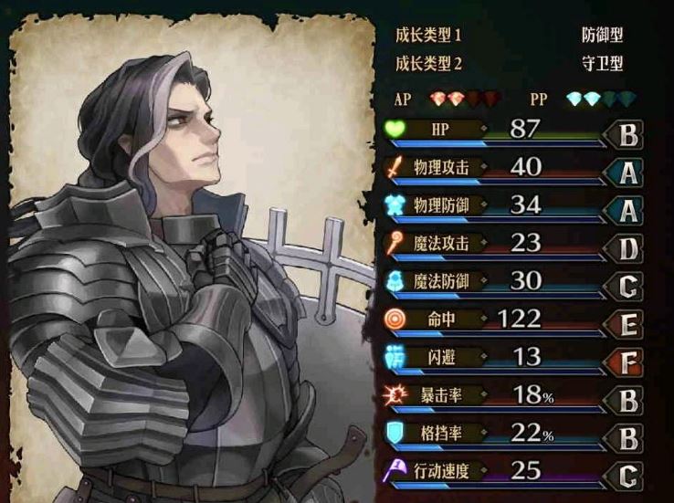 1.成長:物攻防雙a保證了自身優秀的輸出能力和物傷環境裡優秀的坦度。法防c格擋b速度c比較中庸。最大的缺陷是僅有e成長的命中。不過這也是情理之中的平衡,不敢想象命中有c乃至b的騎兵有多離譜。