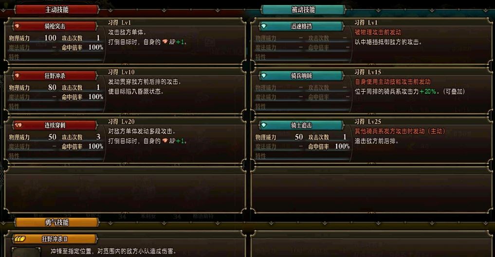5.勇氣技能:超長距離的衝鋒和較高傷害(步兵隊長佔多數)。缺點是消耗3點有點多,同3點的技能有亞連的號令、王子的ap+1和精靈姐妹花的解除等待,實戰意義還是比不過這三個。不過在追求速殺、跳過大量敵人或實在沒法清路障等情況下狂野衝殺就有優勢。