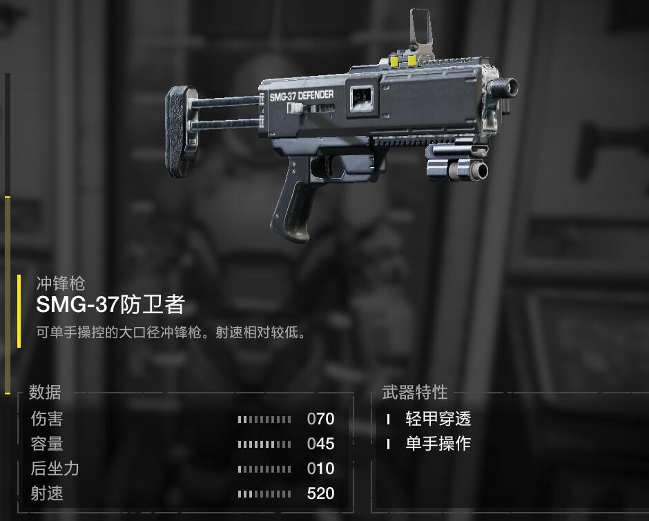 單發傷害比解放者高,子彈容量比解放者高,後坐力比解放者低,只有射速比解放者慢,我一時分不清哪個是衝鋒槍哪個是步槍,不知道是因為以後有武器升級系統還是咋的,有好多槍都被完爆,哦對了這個槍還能單手用,那實在是沒解放者啥事了。因為它單手操作所以運隨身碟的圖可以選一個人帶這個負責拿隨身碟,同時也能配合防爆盾一手持盾一手持SMG,綜合清怪能力感覺僅次於破裂者。