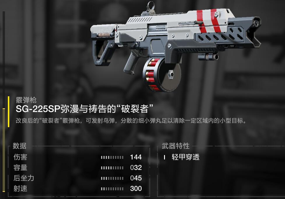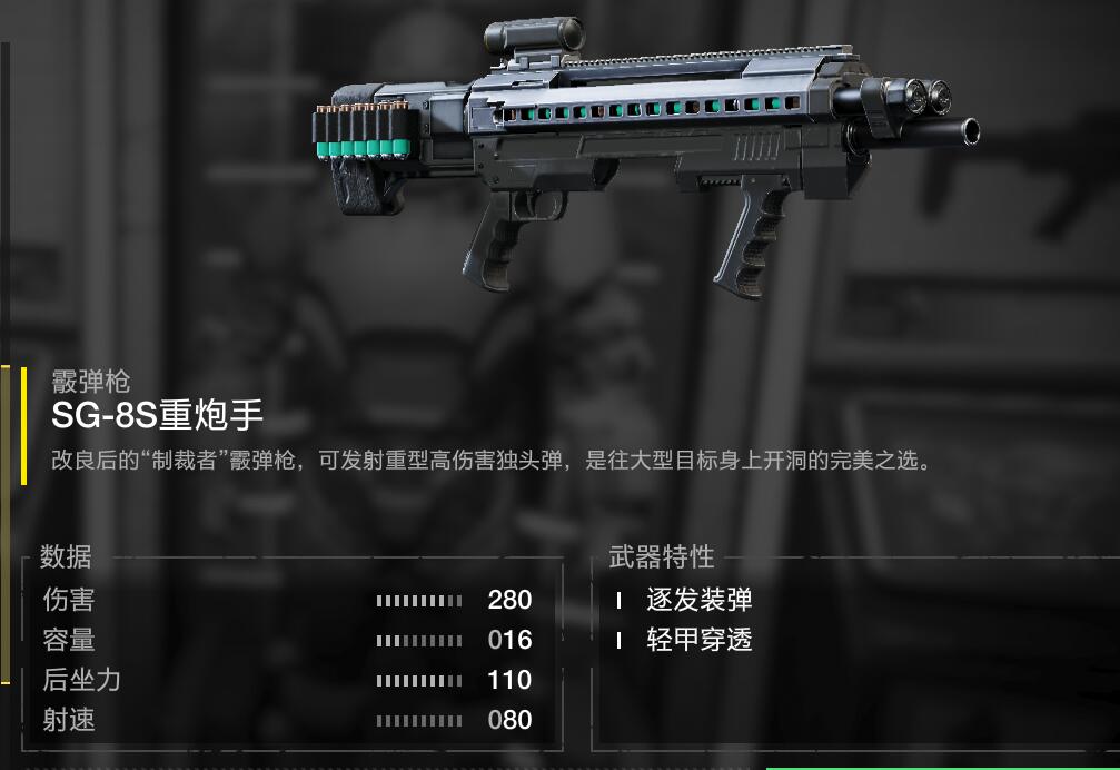 這槍雖然幾乎沒啥討論度,但我想說的是它以外的還行。首先這槍有翻譯錯誤,它應該是中甲穿透。然後它從噴子子彈變成了獨頭彈,所以更加的吃槍法,打空了對面就一滴血不掉,但也正因如此這槍對敵人弱點的打擊很給力。