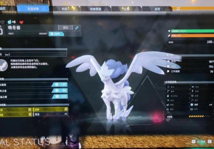再說喚冬獸的自身素質,那也是極其過硬的。作為四傳說boss,野生抓捕的喚冬獸血量大概是家養的2.5倍以上,如果在這個基礎上再刷一些好的詞條,那麼綜合能力最高的帕魯非他莫屬。作為核心技能的鑽石星辰也相當強力,放完之後即可脫手。屬性是相當不錯的冰(後期的boss多龍多暗),可以說野生的四金喚冬是大部分玩家心中的美好夢想,騎上喚冬獸用火箭筒炸空渦龍的爽快感只有體驗才能懂得。