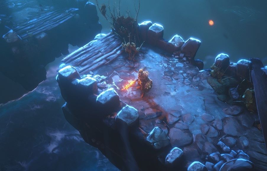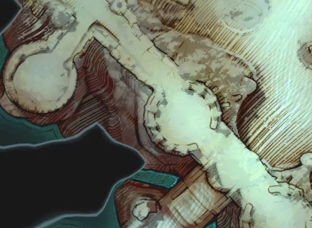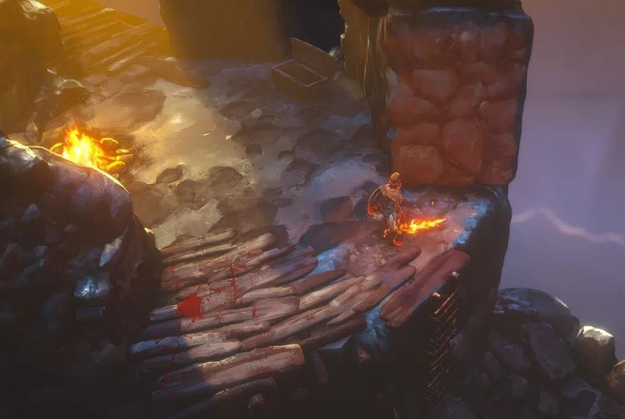 浅瀬の低語の位置から2つの梯子を上ります。頂上に到達したら、壊れた橋の端まで歩き、以前は盾兵がいたところに、今度は料理人のゴードンがいます。ダッシュして隙間を飛び越えます。