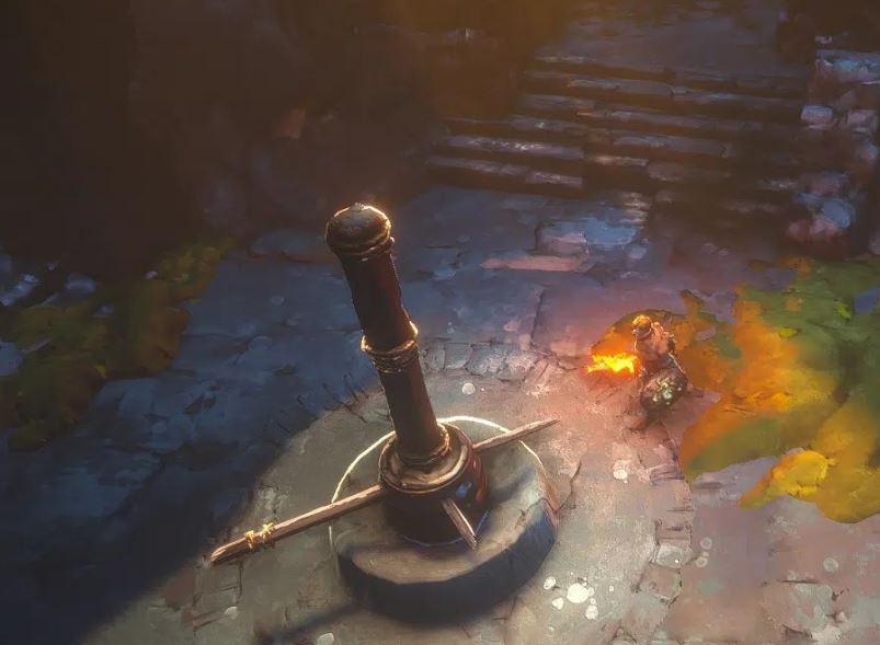 扉を開けた後、左に進んでください。右側には隙間があります。隙間を渡って木製の橋を渡り、橋の先にある焚き火のそばに、別の敵がいます。敵を倒し、宝箱を開けると梯子が現れます。梯子を蹴り落とし、ゴードンと話すために戻ります。彼は感謝を表し、この時点でクエストは終了します。彼を護衛する必要はありません。鍛冶屋と同様に、彼は自分で聖都に戻ります。