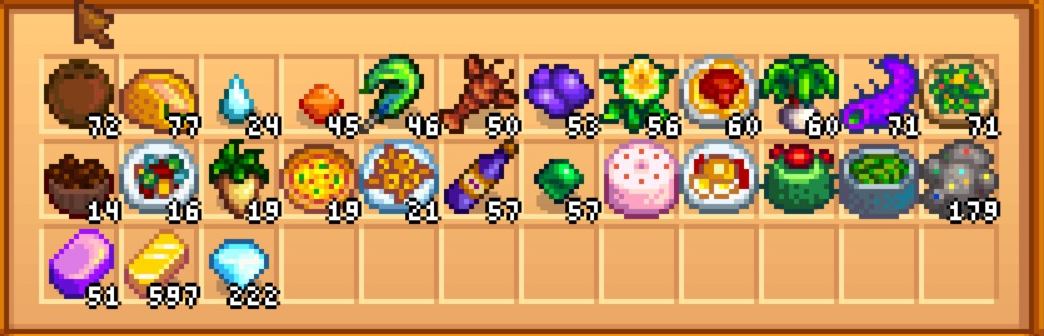 매일 특별 아이템을 생성하는 끝없는 행운의 조각상만 확인하면 어떤 주민이 생일을 맞이하는지 알 수 있으며, 주민의 생일에는 그 주민이 가장 좋아하는 이리듐 별 아이템(예: 이리듐 별 토끼 다리)을 선물하여 별 4개의 호감도를 얻을 수 있습니다. 호감도를 빠르게 최대로 채울 수 있습니다.
